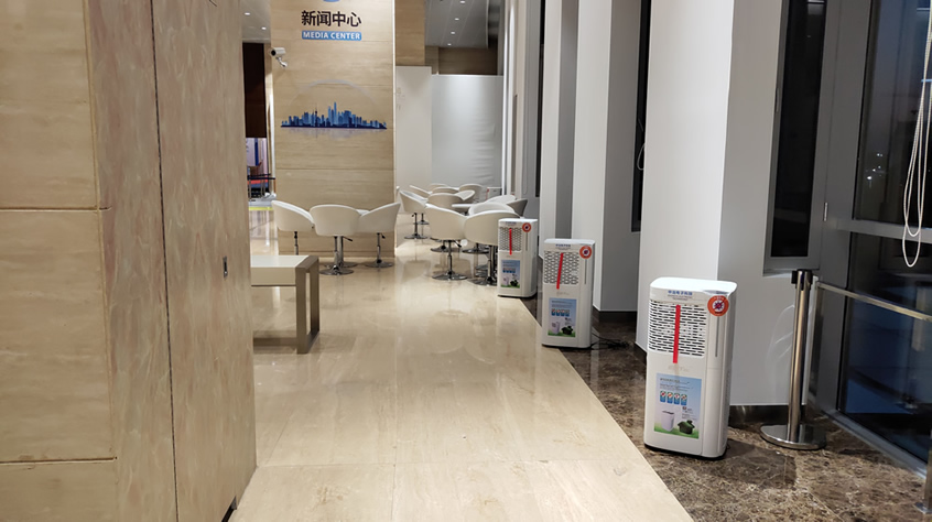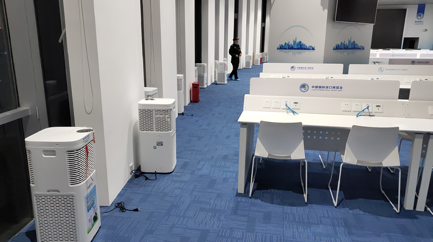 純物理方法殺滅新冠病毒的空氣凈化器在國家會展中心(上海)第三屆進博會10000平方新聞中心安裝完畢,以及新聞中心全體工作人員人手一份的殺滅新冠易呼吸口罩伴侶已送到指定地點,寧波中冶電子科技公司為進博會新聞中心安全防疫保駕護航!